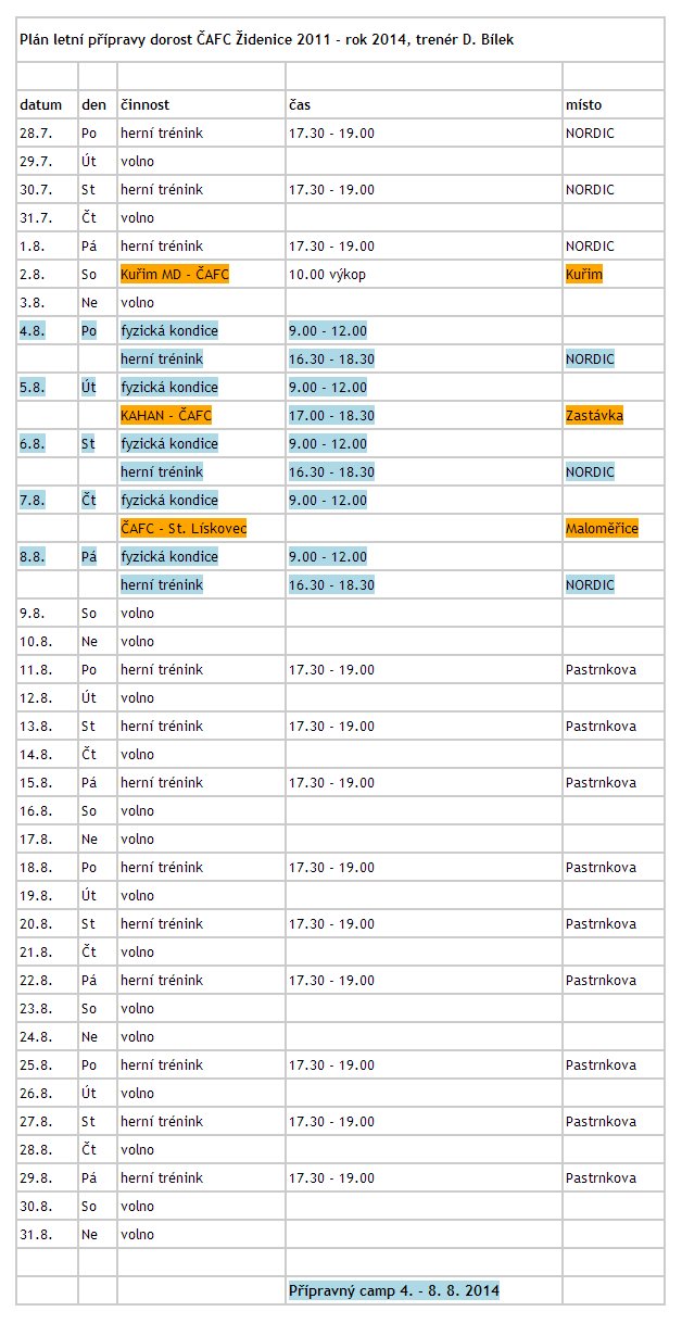 Zahájení přípravy na sezónu 2014/2015 bude v pondělí 28.7.2014, průběh přípravy najdete v přiloženém přehledu dole.