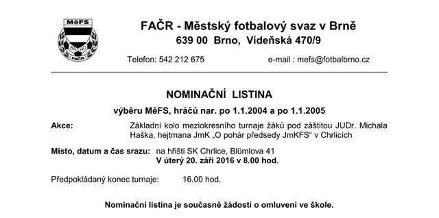 Místo, datum a čas srazu: na hřišti SK Chrlice, Blümlova 41, v úterý 20. září 2016 v 8.00 hod.